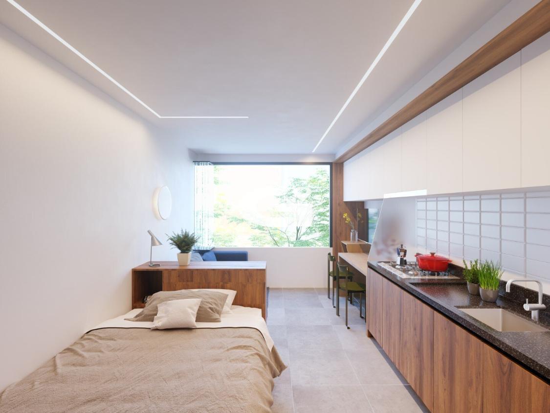 Apartamentos novos com metragens de 26 m² a 74 m², opções de studio, 2 e 3 quartos (com suíte) e unidades garden com amplas áreas externas e churrasqueira.