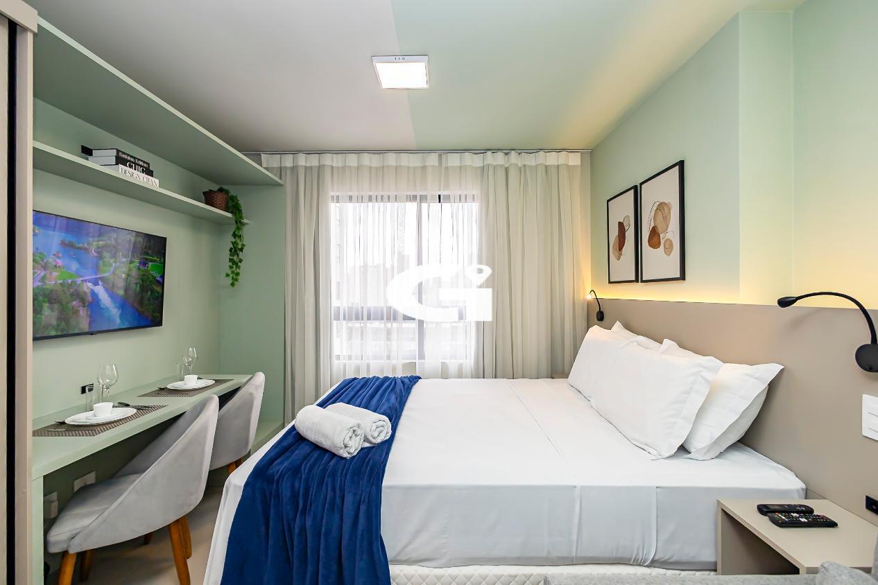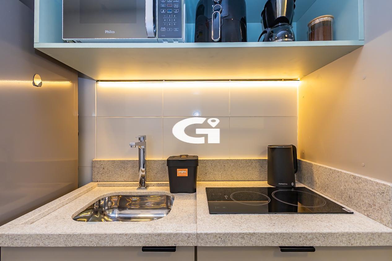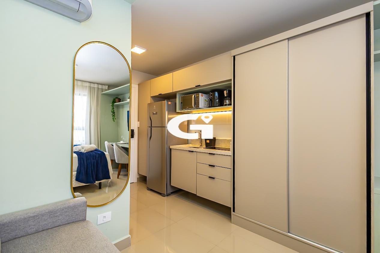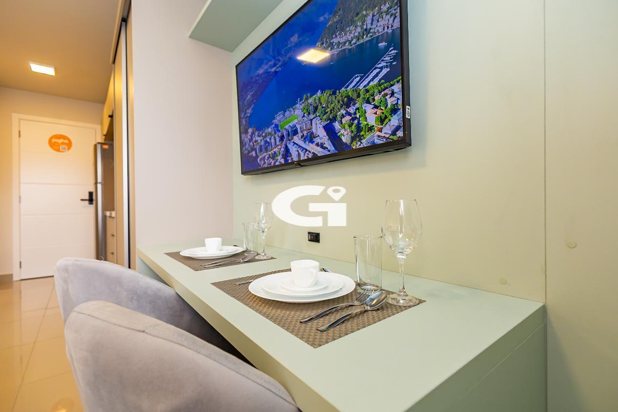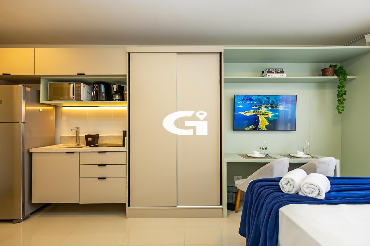 O studio conta com mobília completa, incluindo cama, armários planejados, mesa, eletrodomésticos e cozinha equipada, proporcionando uma experiência pronta para morar, sem necessidade de reformas ou gastos adicionais.