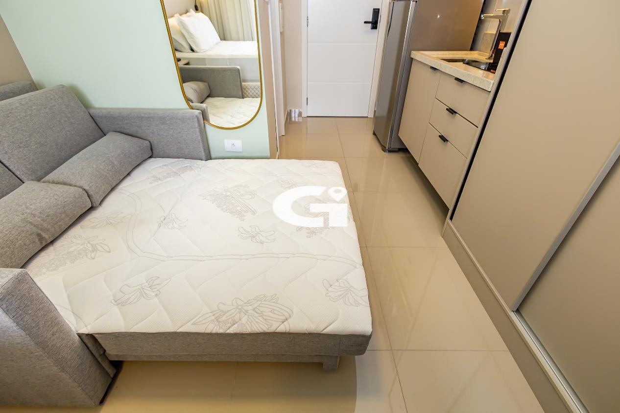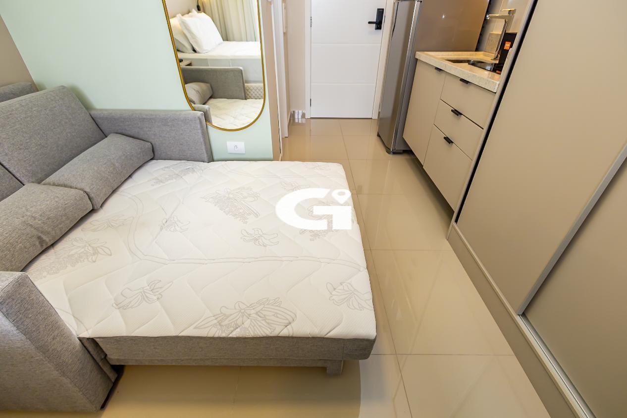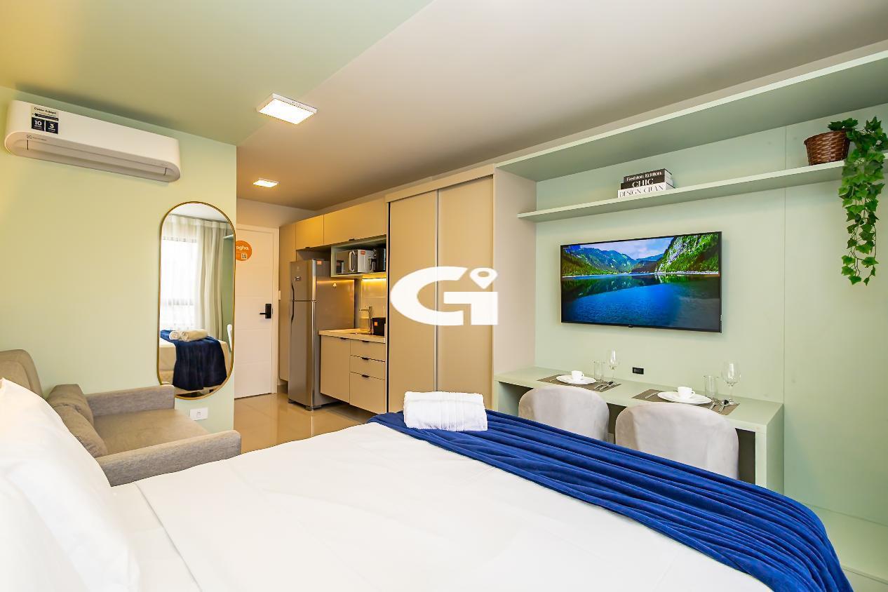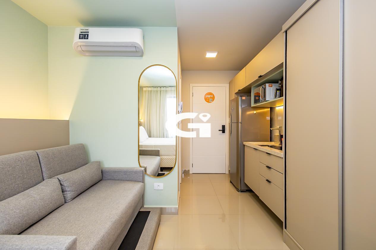 O studio conta com mobília completa, incluindo cama, armários planejados, mesa, eletrodomésticos e cozinha equipada, proporcionando uma experiência pronta para morar, sem necessidade de reformas ou gastos adicionais.