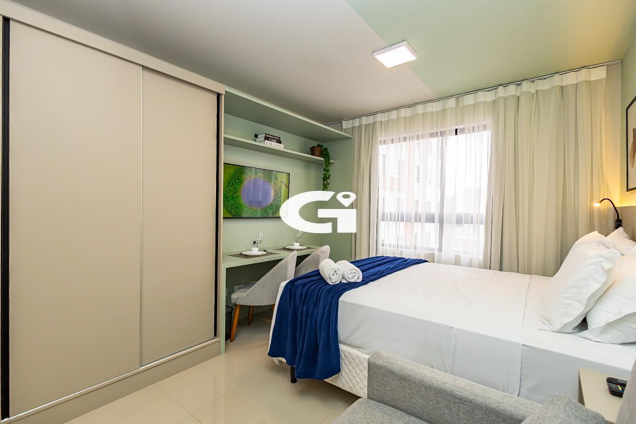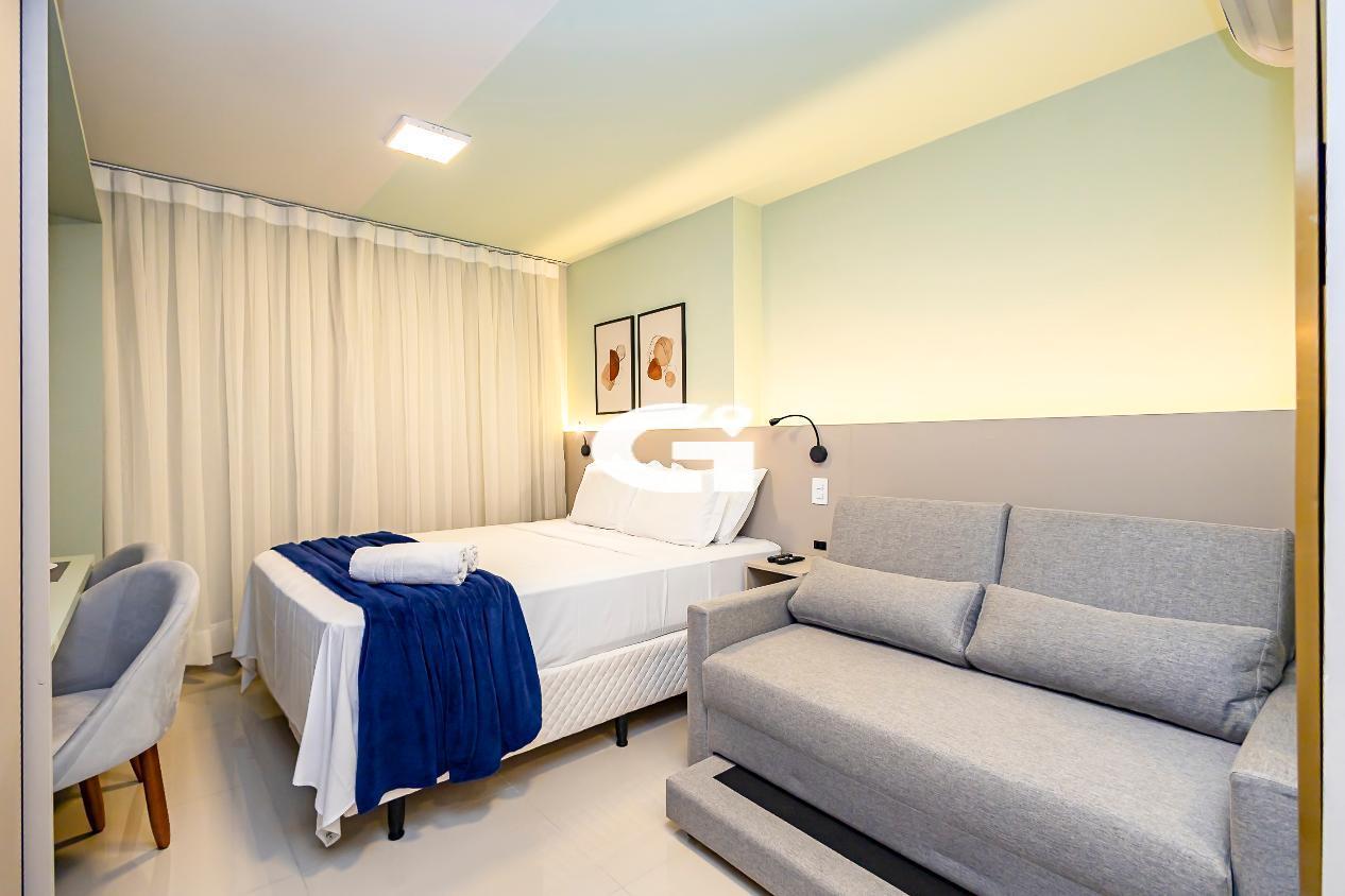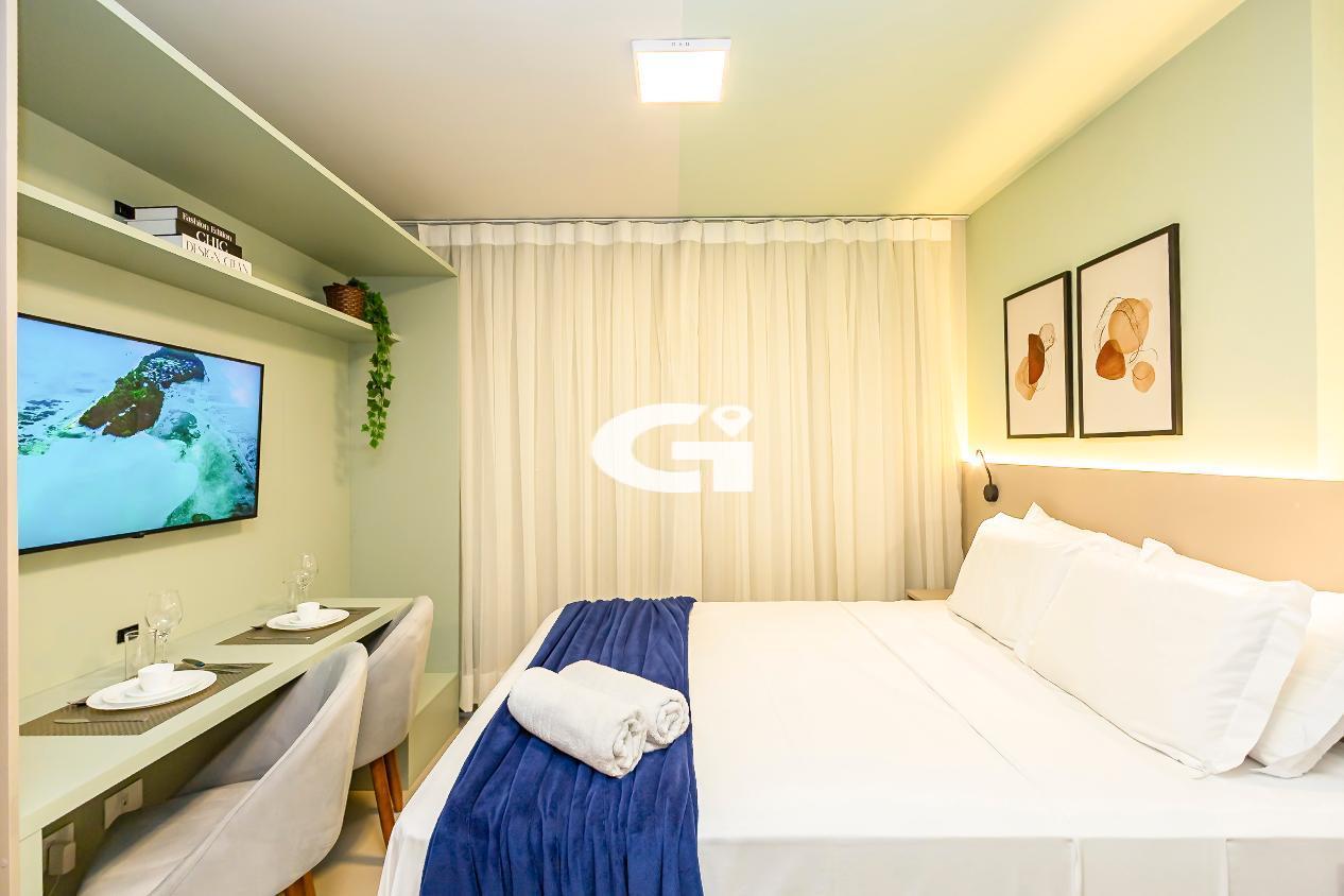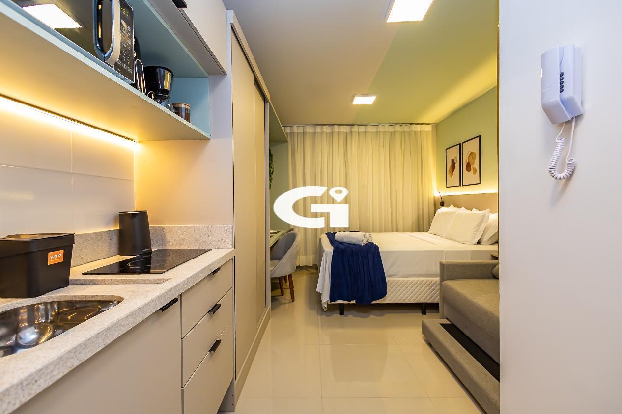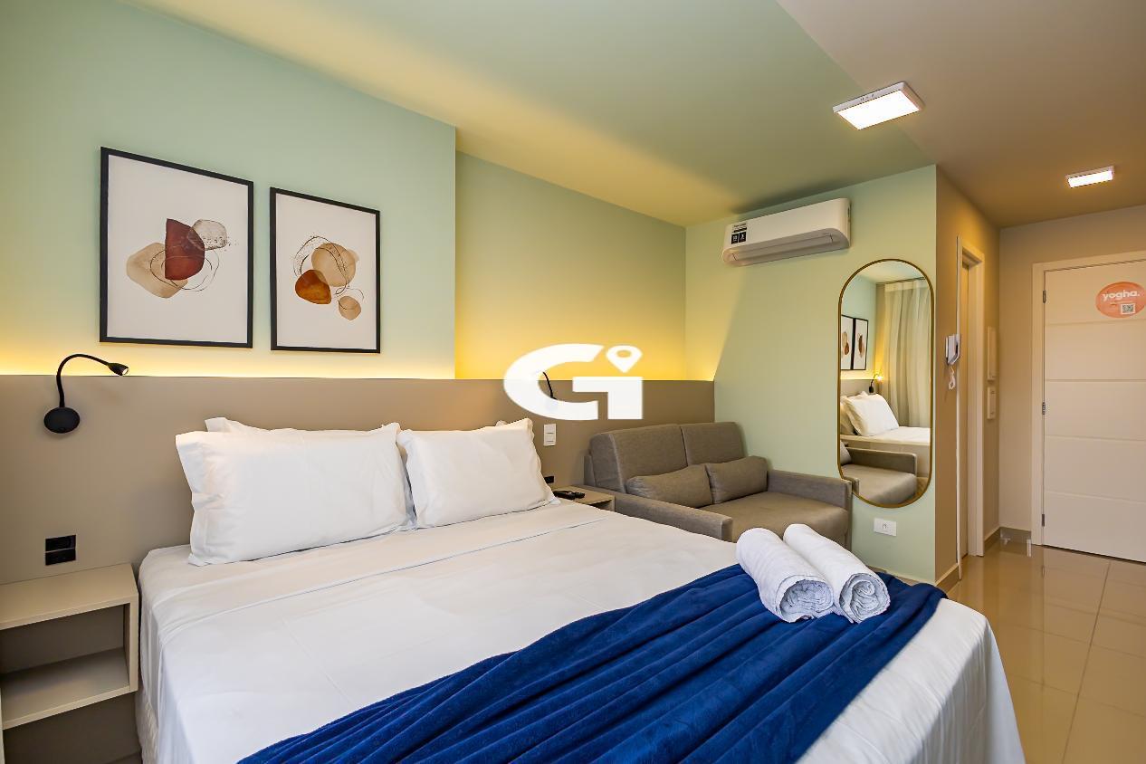 O studio conta com mobília completa, incluindo cama, armários planejados, mesa, eletrodomésticos e cozinha equipada, proporcionando uma experiência pronta para morar, sem necessidade de reformas ou gastos adicionais.